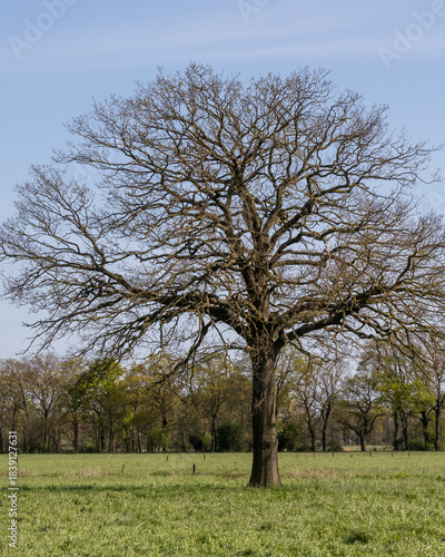 © Ulrich, Obraz premium Lonely tree stands tall in open field during early spring under clear blue sky