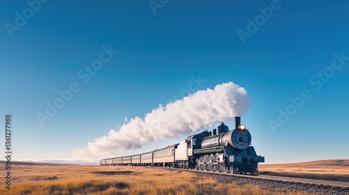Obraz premium lonely vintage steam locomotive traverses through empty expansive countryside...
