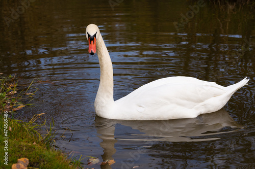Obraz premium Lonely white swan in a beautiful small pond on the water