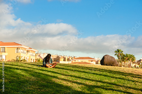 © smspsy, Obraz premium lonely woman lies on the beach and reads an e-book