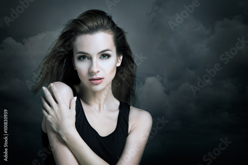 Fototapeta premium Lonely Woman on the Background of Dark Clouds
