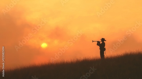 © Jakkarin, Fototapeta premium Lonesome Bugler Silhouetted on a Scorched Hillside at Sunset