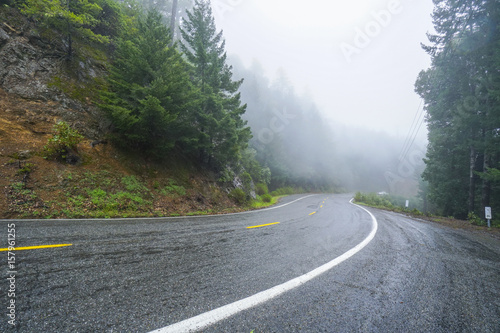 Naklejka premium Lonesome road in the mist leading through the Redwoods National Park