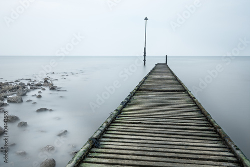 Fototapeta premium Long abandoned rotted jetty leading out to sea on a cold misty afternoon in...