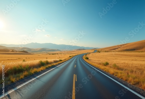 Fototapeta premium Long and Winding Road Through Picturesque Countryside: A Curvy Asphalt Road Leading Through a Beautiful Field with a Clear Blue Sky