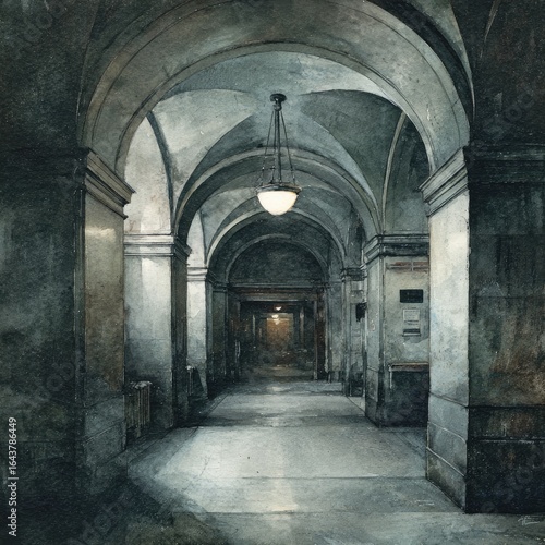 Fototapeta premium Long, arched hallway, muted tones. Vast, stone corridor, dimly lit