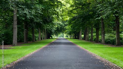 Fototapeta premium Long Asphalt Path Lined With Green Trees And Lush Grass Under Bright Daylight