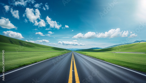 Fototapeta premium Long asphalt road through green grass field under blue sky, travel and freedom concept