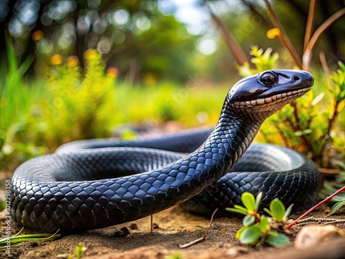 © Danicha, Fototapeta premium Long black snake slithering across the ground in a natural habitat during a sunny day in nature