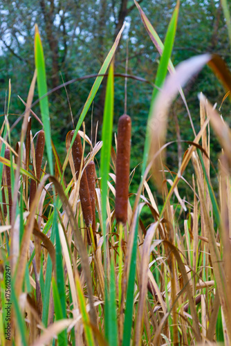 © Олег Струс, Fototapeta premium Long brown cattail inflorescences stand upright among tall green and dry stems against a backdrop of blurred trees. This image conveys the atmosphere of an autumn swamp or pond, emphasizing the vertic