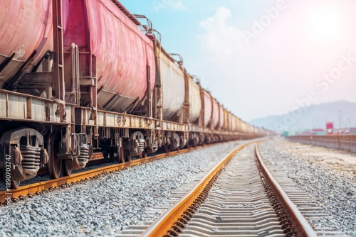 © Putra, Fototapeta premium Long Cargo Train Passing Through Open Land During Bright Daylight