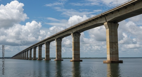 © Fan_, Fototapeta premium Long Concrete Bridge Crossing Water with Cloudy Blue Sky Above