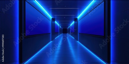 Fototapeta premium Long corridor features bright blue lighting. Walls recede into darkness,...