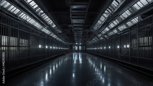 Fototapeta premium Long corridor in a dimly lit prison with barred cells on both sides and a...