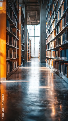 Fototapeta premium Long Corridor Lined With Bookshelves in a Modern Library With Large Windows Allowing Natural Light to Illuminate the Space
