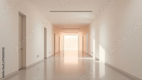 © Lynniee, Fototapeta premium Long corridor with bright lights and minimalist architectural lines.