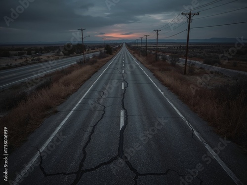 Fototapeta premium Long cracked desert road stretching towards a dramatic sunset under a vast,...