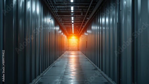 © olegganko, Fototapeta premium Long Dark Corridor With Lights on the Walls Seen in a Building During Night Time