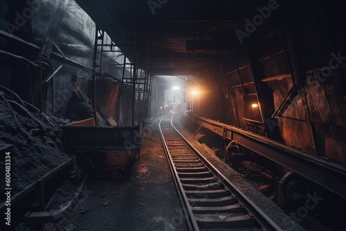 Naklejka premium Long dark journey with a glimpse of light in a coal mine. generative AI