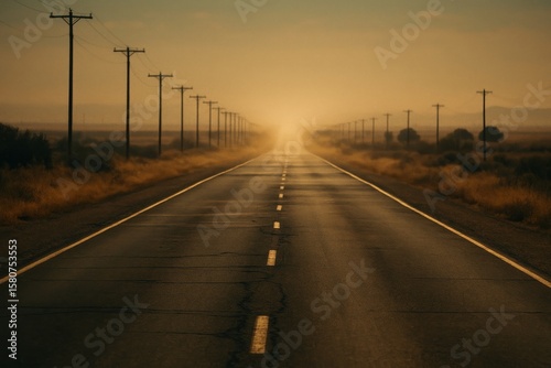 Fototapeta premium Long desert highway with heat mirage and distant cars, evoking travel,...