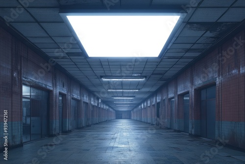 © NikahGeh, Obraz premium Long, Desolate, Tiled Corridor with Fluorescent Lights