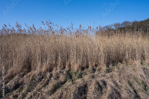 Obraz premium Long dry reeds with a blue sky in the background. Picture from Hamburgsund,...