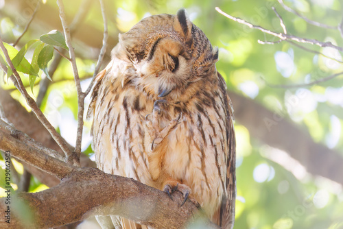 Obraz premium 木立の中で昼寝する美しいトラフズク(フクロウ科)。 たまに目覚めて羽づくろいをしたりする。 英名学名:Long-eared Owl, Asio otus 栃木県栃木市渡良瀬遊水地-2025