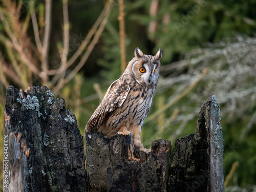 Obraz premium Long-eared owl (Asio otus) sitting on the tree. Beautiful owl with orange...