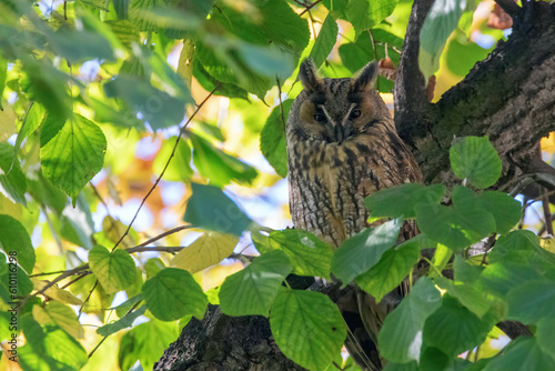Fototapeta premium Long Eared Owl sitting on a tree (Asio otus)