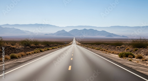 © Mehdi, Fototapeta premium Long empty highway leading toward distant mountains under clear blue sky