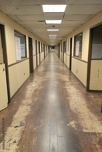 © bcendet, Obraz premium Long empty office corridor with dirty floor.