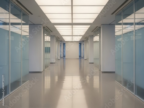 © Vooglo.com, Naklejka premium Long empty office corridor with glass walls and white columns and shiny floor