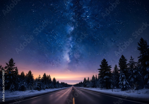 © Background, Fototapeta premium long empty road leading to the milky way galaxy in the starry sky