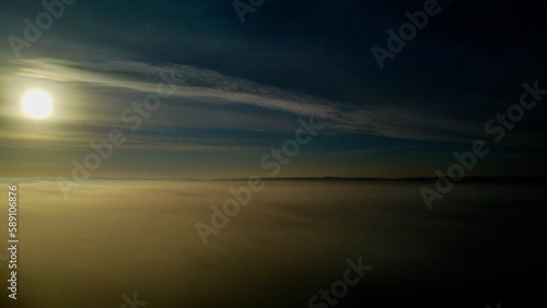 Fototapeta premium Long-exposure aerial view of a steam-covered seascape at sunset