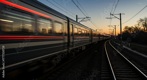 Naklejka premium Long exposure captures a modern train speeding along tracks at dusk, vibrant...