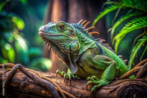 © Sirinporn, Obraz premium Long Exposure: Green Iguana on Ancient Branch - Tropical Wildlife Photography