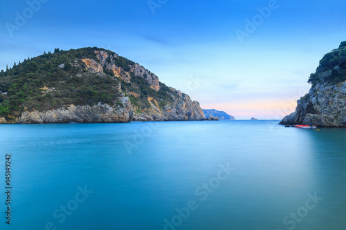 © Sodel Vladyslav, Fototapeta premium Long exposure landscape of Paleokastritsa famous sand beach in close bay on Corfu island at dusk, Ionian archipelago, Greece.