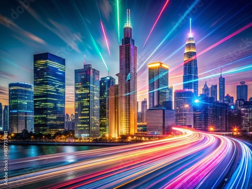 © Sirinporn, Fototapeta premium Long Exposure Light Trails on Cityscape: Business Flyer Template Design