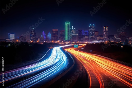 © app, Fototapeta premium Long exposure nighttime view of a city skyline with illuminated skyscrapers and vibrant light trails of red and white vehicles on a highway curving towards the city