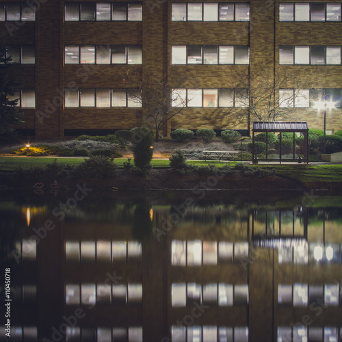 © jeffcampbell, Obraz premium Long exposure of a office building and lake at night