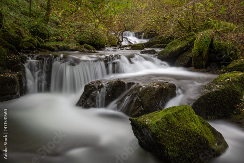 © tom, Fototapeta premium Long exposure of a waterfall flowing through the woods at Watersmeet in Exmoor National Park
