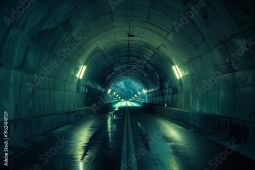 © nsit0108, Fototapeta premium Long exposure of an empty wet asphalt road running through an illuminated tunnel at night