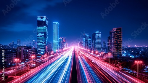 © atdigit, Fototapeta premium Long Exposure of Busy City Street at Night with Vibrant Light Trails