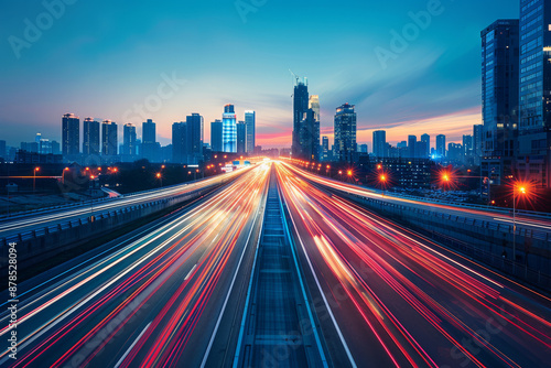 © Trichaiwat, Fototapeta premium Long Exposure of Busy Highway at Night with Light Trails