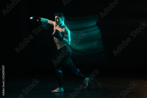 Fototapeta premium Long exposure of green light and sporty muscular mma fighter doing punch on black