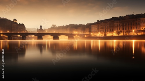 © iAmP, Naklejka premium Long exposure of light reflections in a city, golden hour lighting, empty space on the left for text,generative ai illustration