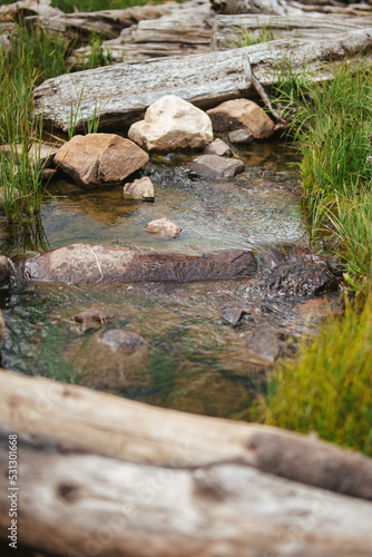 Fototapeta premium Long exposure of motion blurred stream flowing gently through rocks and logs...