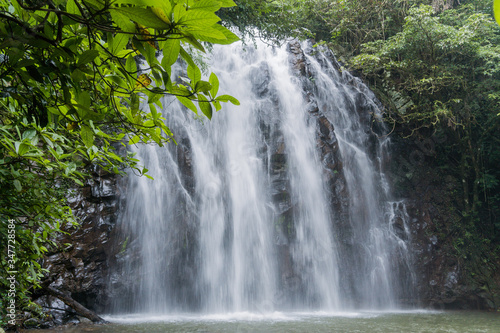 Fototapeta premium Long exposure of waterfall in tropical rainforest with palm and green leaves....