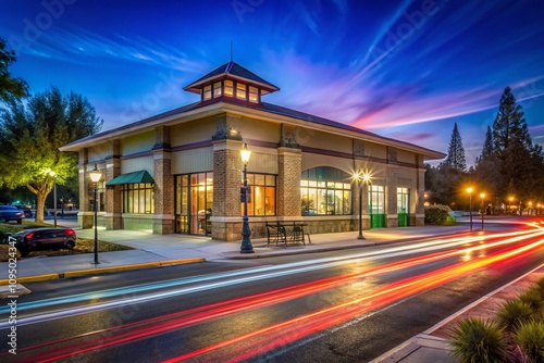© Supittra, Fototapeta premium Long Exposure of Woodland Public Library Sign and Building in Woodland, California, Showcasing Architectural Beauty and Community Engagement at Night with Illuminated Features