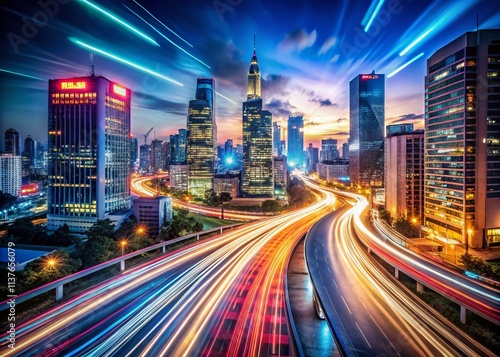 Fototapeta premium Long Exposure Photography: Business Podcast Success, Night City Lights, Blurred Motion, Professional Growth, Marketing Strategy